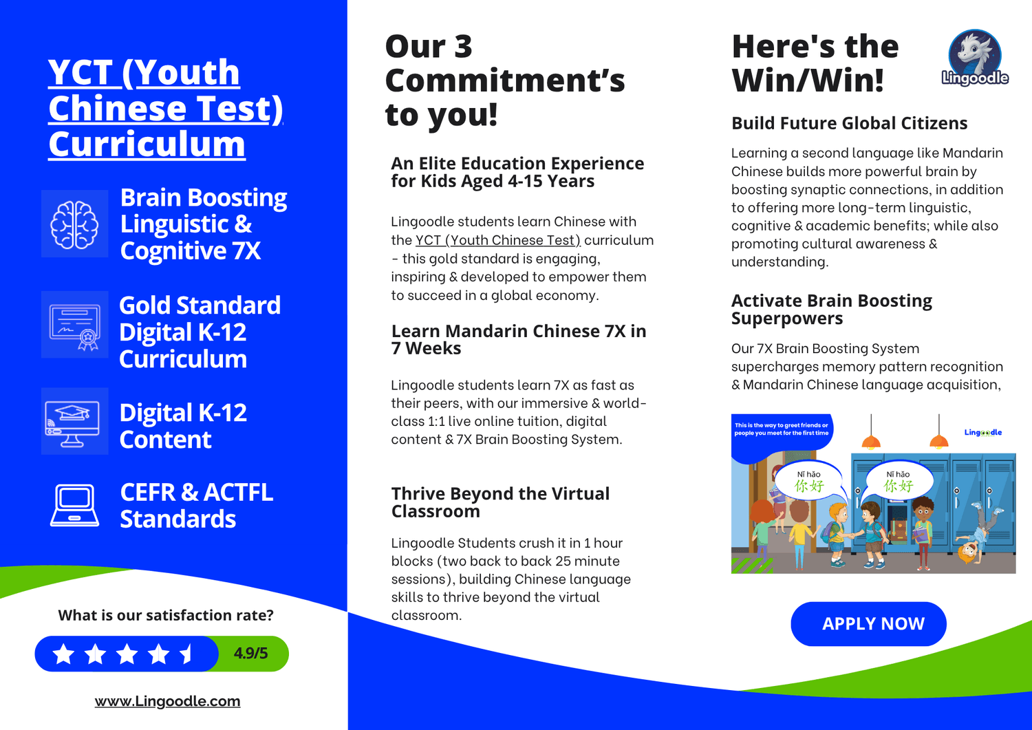 As the world's most popular Chinese language curriculum; the YCT (Youth Chinese Test) Standard Course empowers young learners to use Chinese in daily & academic life and is the gold standard in Chinese language tuition.