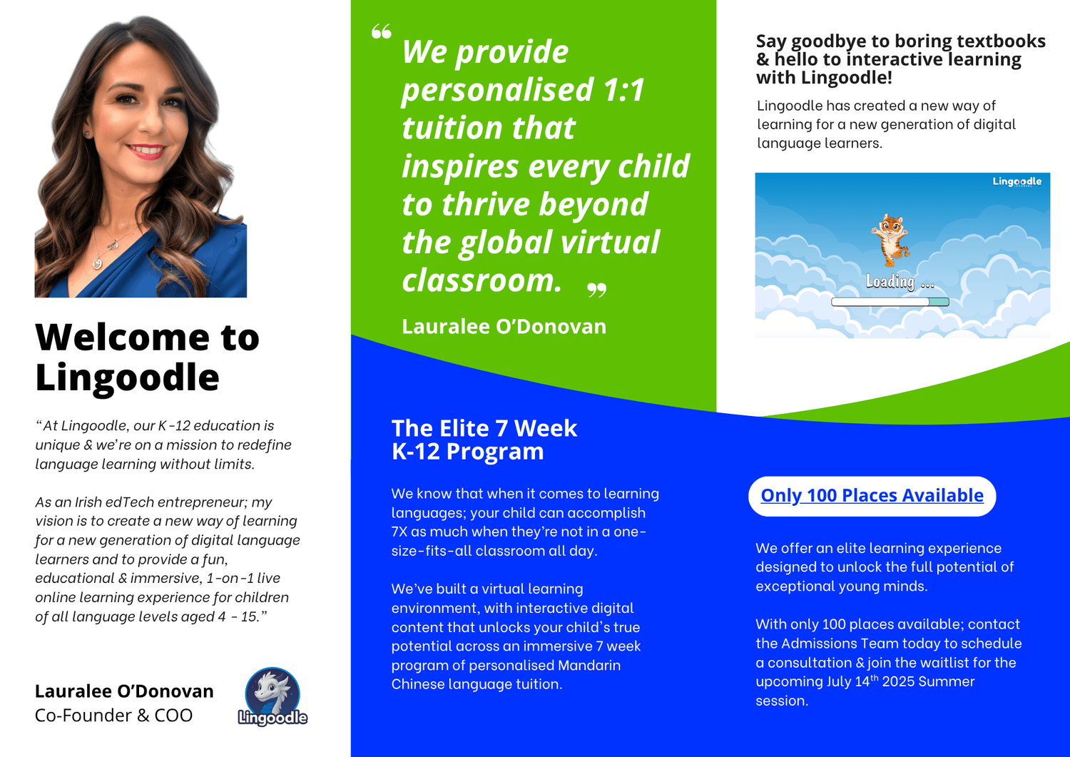 Lingoodle provides age-appropriate, highly interactive & brain boosting, personalised 1:1 live online tuition, developed to accelerate the acquisition of linguistic & cultural fluency in a global virtual classroom.